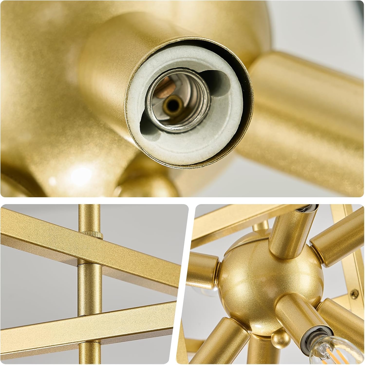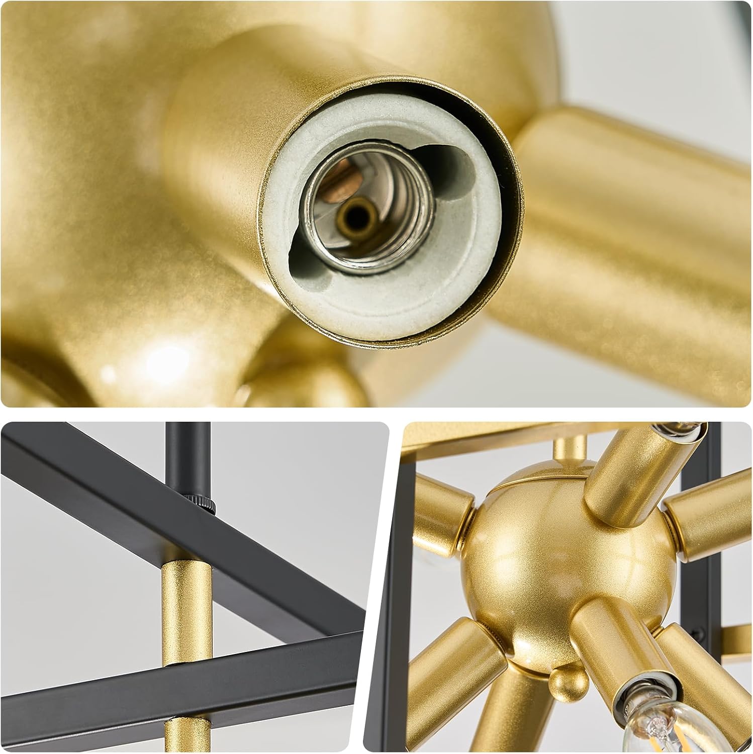 Mid-Century Modern Design with Industrial Appeal This geometric chandelier features a striking square frame that combines black and gold finishes for contemporary sophistication. The industrial-inspired design with clean lines and bold geometry creates a stylish focal point that adds warmth and character to any space. Its versatile aesthetic complements both modern and traditional interiors seamlessly.